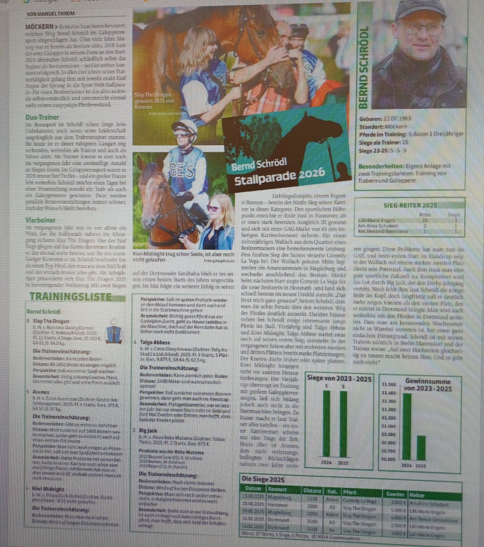 Seitens der Besitzertrainer wurde mit der Sport-Welt-Ausgabe 2 vom 9. Januar mit Janina Boysen (hier1/hier2), die zehn Siege 2025 geschafft hat, gestartet. Jetzt folgten mit Ausgabe 3 vom 16. Januar Caroline Pietsch (6 Siege - hier1/hier2) und Bernd Schrödl (5 Siege - hier) Weiter dabei sind Christian Peterschmitt (13 Siege), Anna Schleusner-Fruhriep (12), Daniel Paulick (8), Adel Massaad (8), Hella Sauer (7), Marc Timpelan (6) und Pavel Bradik (5). Zudem gibt es die Sonderveröffentlichung von Alica Baum.